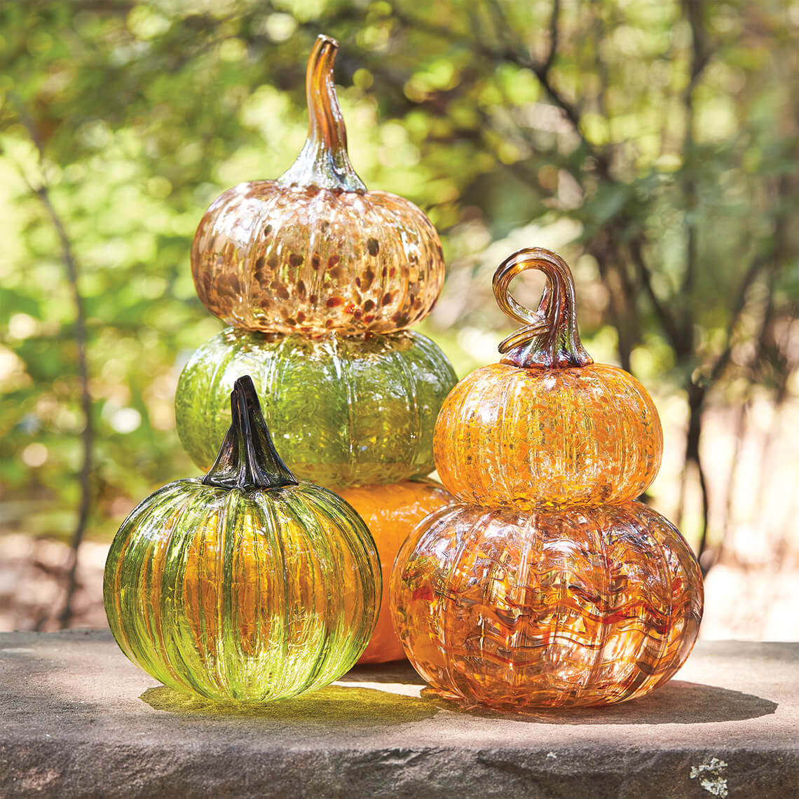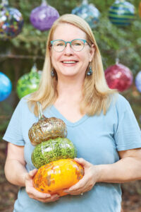 Lisa Oakley and other artists create glass pumpkins to sell solo or stacked at Cedar Creek Gallery in Creedmoor. The colorful stacks can reach 18 inches tall. photograph by Eric Waters