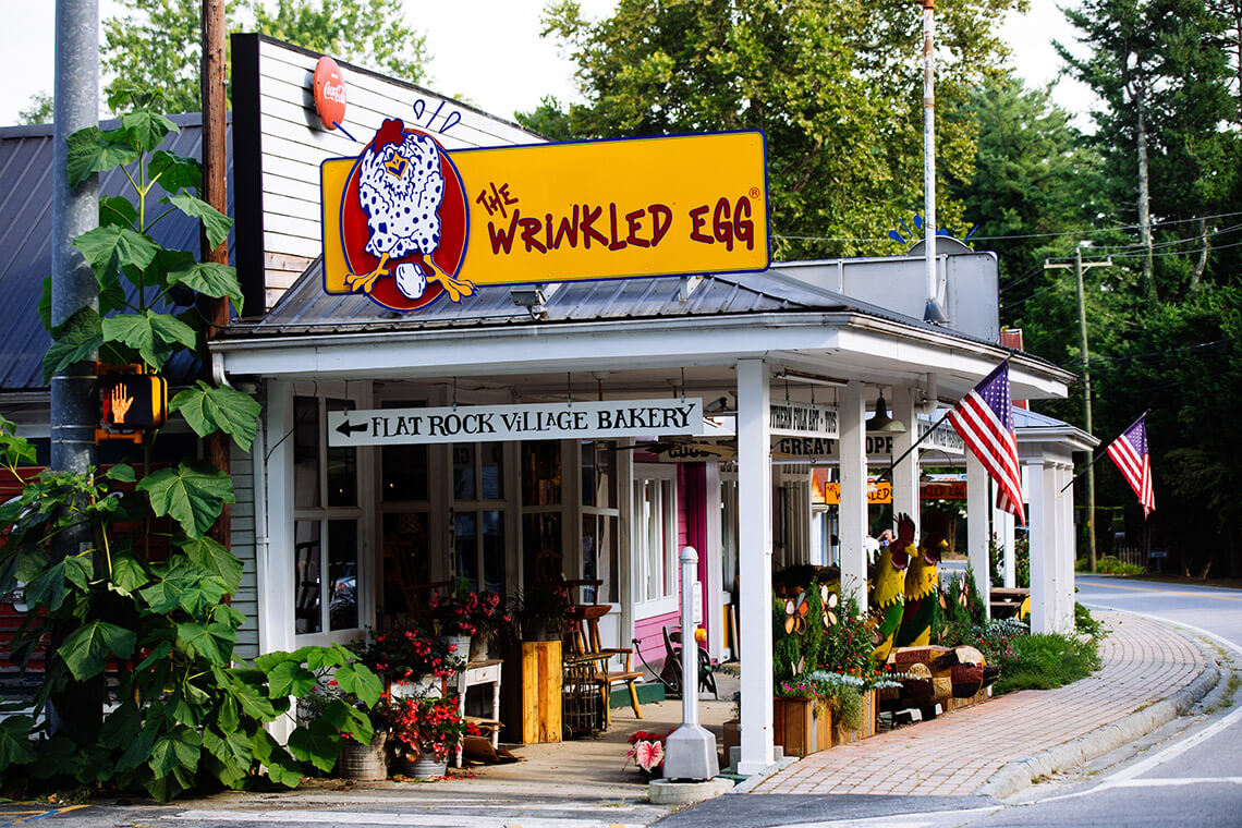 After grabbing something delicious at Flat Rock Village Bakery, wander through the adjoining gift shop at The Wrinkled Egg — a colorful, character filled store housed in a former grocery store that’s anchored this stretch of Little Rainbow Row for decades. The name itself tells a story — inspired by a legendary Rhode Island Red hen known for its “wrinkled” eggs — and the shop’s personality is just as charmingly quirky. Visitors often linger to browse the colorful displays and pick up souvenirs from home goods and paintings and pottery from local artists to clothing and toys. Before you leave, pay a visit to the shop’s two miniature Holland lop-eared bunnies. “The adults love them as much as the children,” says owner Virgina Spigener.
