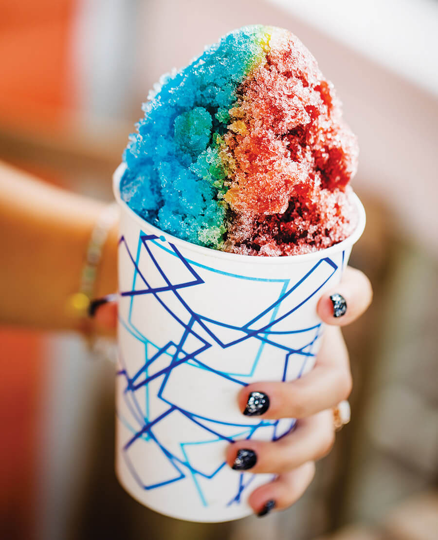 The watermelon pink cedar-shake building on the side of the road hints at the brightly colored treats inside: Twelve flavors of ice cream or frozen yogurt topped with shaved ice in any number of the shop’s 62 syrup flavors. Can’t decide on just one? Try the Rainbow blend.