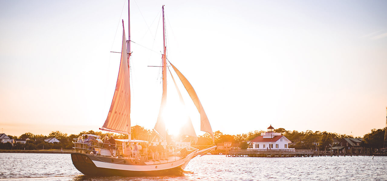 Wind whips the sails of the 55-foot topsail schooner Downeast Rover, propelling it forward as dolphins play in its wake. Capt. Kim Winslow steers the boat through Roanoke Sound, pointing out the top of the Wright Brothers National Memorial in Kill Devil Hills while taking advantage of the very same conditions that benefited Orville and Wilbur’s flight experiments. “The Outer Banks is perfect for one very good reason: the wind,” says Winslow, who owns the boat with his wife, Kimberly. “There is almost always a good wind, which means we really can sail.”
