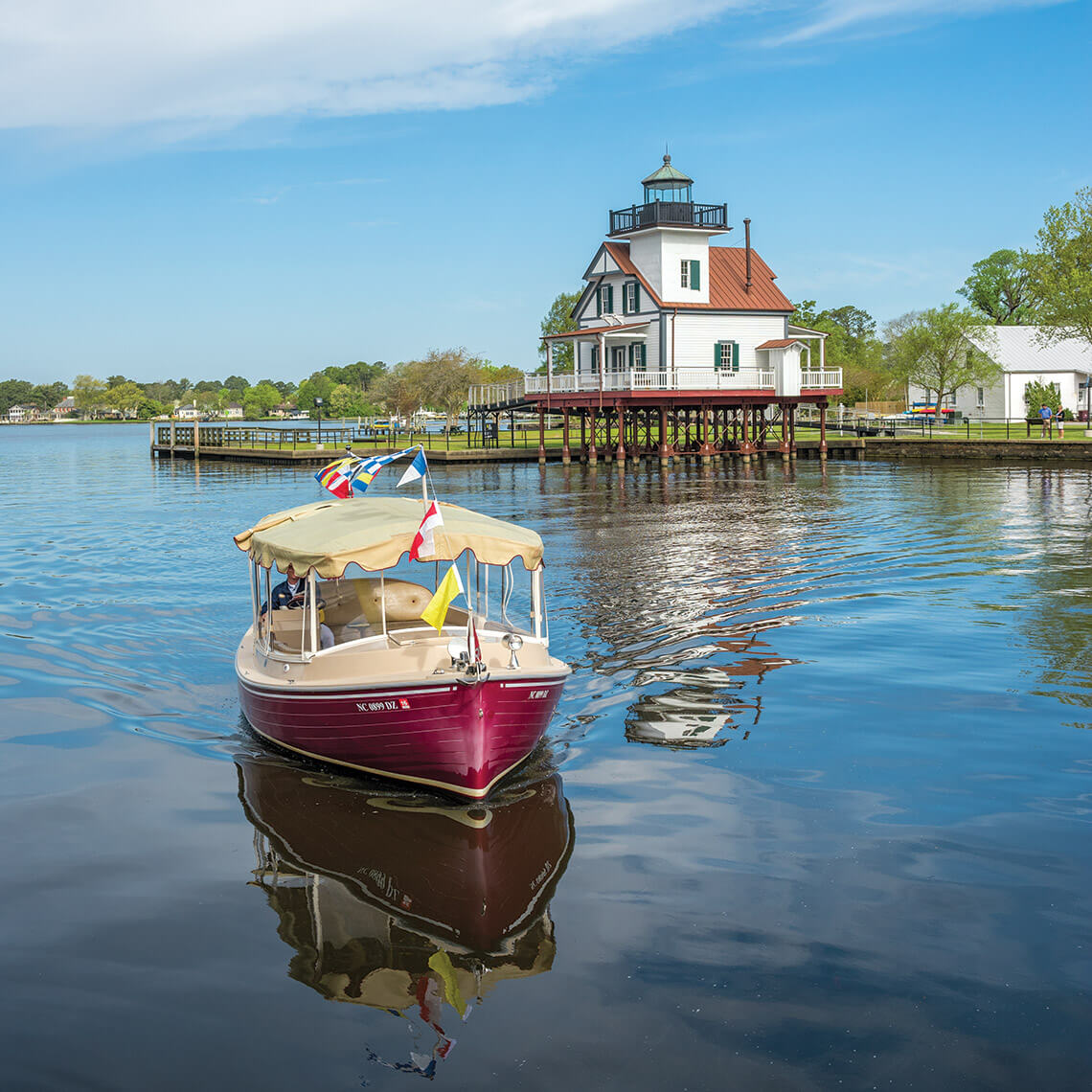 Gliding along the Edenton waterfront, Capt. Mark Thesier points out the 1767 Chowan County Courthouse, the oldest in North Carolina; the 1886 Roanoke River Lighthouse, the only remaining screw-pile lighthouse in the state; and John’s Island, a privately owned nature preserve. The quiet electric motor of the Liber-Tea, owned by Thesier and his wife, Theresa, allows him to keep a conversational volume while sharing historical facts and stories with his passengers. Other than his occasional narration, he says, “the only thing you hear as we’re cruising along is the ripple of the water.” And maybe the occasional honk from his conch shell, which the Coast Guard has approved as one of the boat’s official horns.