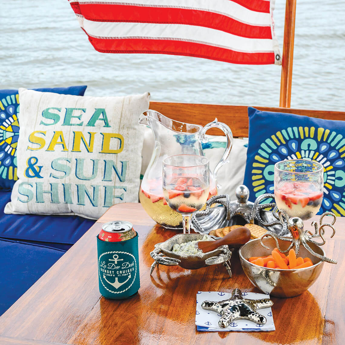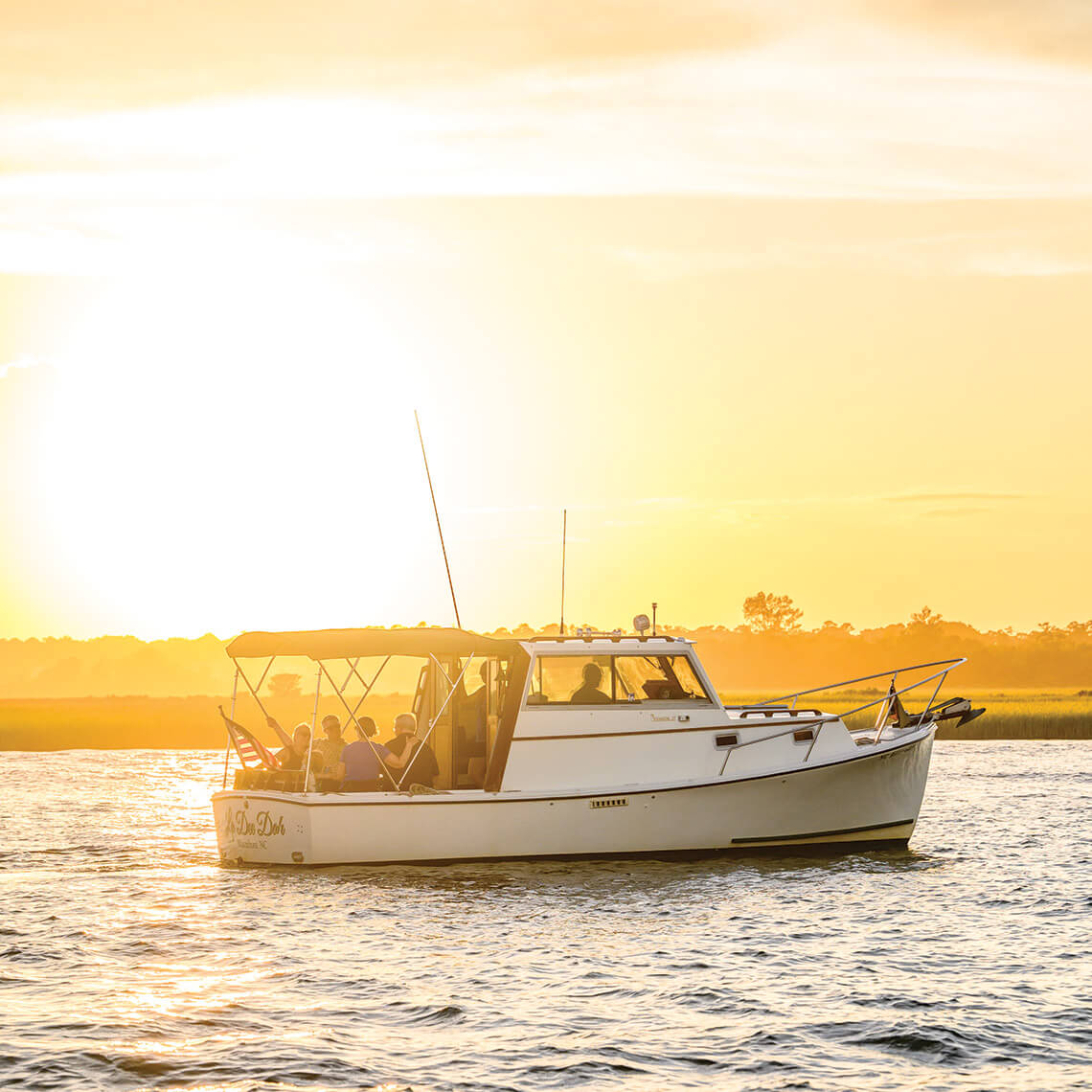 The La Dee Dah keeps a relaxed pace as it travels from its departure point at Motts Channel Seafood — a 32-year-old fish house in Wrightsville Beach — through its two-hour, 10-mile journey. It moves along the Intracoastal Waterway and other local waterways and sounds, past Masonboro and Harbor islands. Capt. Axel Erkes inherited his love of the water from his dad, who always had a boat around for his sons when they were growing up. Erkes shared that love with his first mate and wife, Patti, during their courtship, and, after taking sunset cruises on vacations, the couple was inspired to offer a similar service back home. “Most people who visit never get to see Wrightsville Beach from the water, which is a whole different perspective,” he says. The pair love to hear passengers’ stories — if you come as a couple, be prepared to explain how you met — and tell a few of their own along the way, including the history behind their 1987 Downeast picnic cruiser. On the return trip, the sun slides below the tree line, casting a pearlescent shimmer of orange and pink across the teal water.