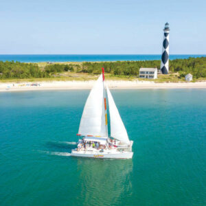 The Lookout catamaran motors about an eighth of a mile out from the Beaufort waterfront to a spot behind the dunes, where the first mate asks for volunteers to pull up the sails. It takes two, three, sometimes four people to raise the 150-pound mainsail and the jib — or front sail — while the other passengers cheer them on. From there, it’s off to wherever the wind takes them. “We don’t have a destination,” says Capt. Steve Bishop. Depending on the conditions of the wind and water, the Lookout might sail behind the maritime forest and dunes of Shackleford Banks — often offering a glimpse of wild horses — or, in calmer weather, out to the ocean. There, Bishop points out Fort Macon, constructed after the War of 1812 and established as a state park in 1924, and the site of the wreck of what is believed to be the Queen Anne’s Revenge — Blackbeard’s flagship.