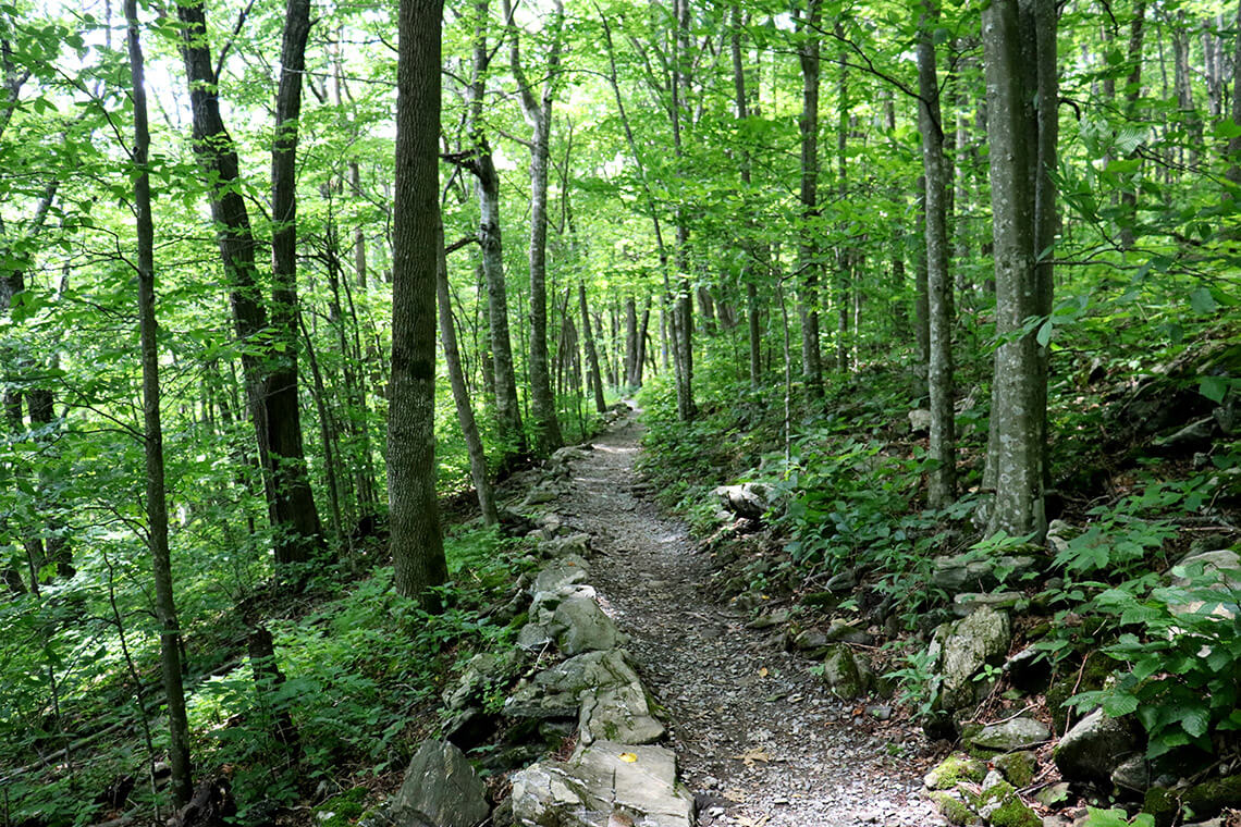 Along the trail, pileated woodpeckers can be seen pecking at snags while foraging for insects, and cardinals can be spotted flying in the understory, looking for mates. Many species of warblers — including northern parula, common yellowthroat, and black-throated blue — stop over on the mountain in the spring on their way north. Trillium flowers can be seen blooming in April and May throughout the hike.
