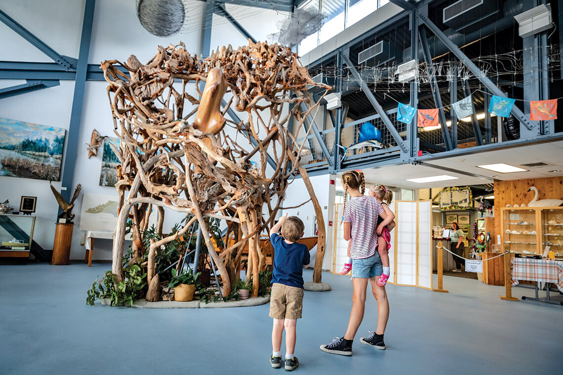 In the lobby of this museum — the only education center in the state that interprets the science of estuaries — a giant, interactive driftwood sculpture, completed in 1998 by former public school art teacher and artist Whiting Toler, conceptually shows how the water cycle works.