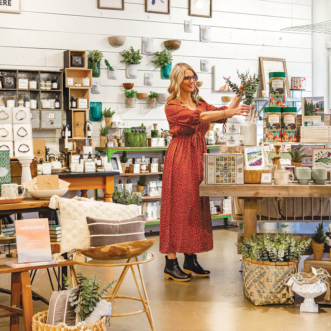 Colette Morris pulls a Fraser fir candle off a shelf, opens the lid, and passes it to a customer shopping at Robin Blu, Morris’s home goods store in Waynesville. She explains that this festive scent — a classic combination of pine and cedarwood — is reminiscent of a freshly cut Christmas tree. In addition to candles, nearly every inch of the building is filled with wall art, coasters, kitchen towels, and trinket dishes. “I want to have the kind of store that kindles excitement, gives people creativity to implement beautiful decor into their home,” Morris says. The shop was founded in 2012 by her mother and the business’s namesake, Robanne Morris. After her mother retired in 2018, Colette purchased the business the following year and added a second location on North Main Street. “My mom always made our home and the store feel so special,” she says. “I want to honor her legacy by bringing that to light.”