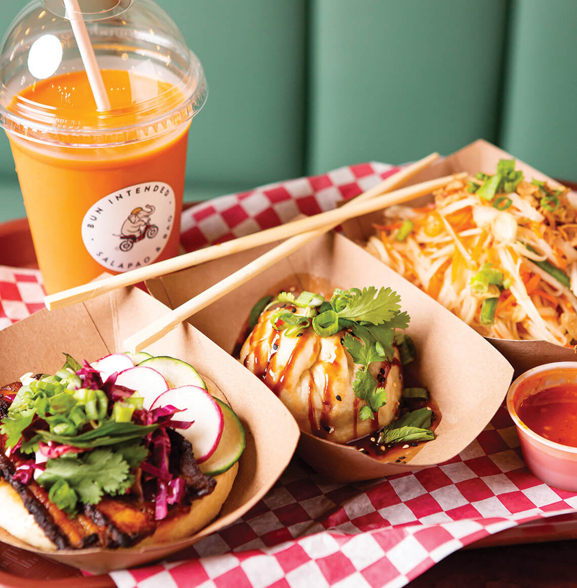 From left: pork belly bao; salapao, or pulled pork enclosed in a steamed bun; and spicy som tum, or green papaya salad from Bun Intended. photograph by Tim Robison