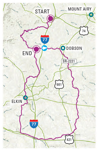 Beginning on NC Highway 89 at the intersection of Round Peak Church Road, this wine country byway rolls through farmland and foothills, over and along rivers, and past vineyards and historic structures, offering views of our iconic Pilot Mountain.