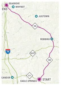 In Robbins, the Bear Creek Trail System features 14 miles of trails along Bear and Cabin creeks. After a hike, Carolina Fried Chicken and House of Pizza is a great place to replenish your energy, and just northwest of town on the byway, Cagle’s Diner offers down-home cooking.