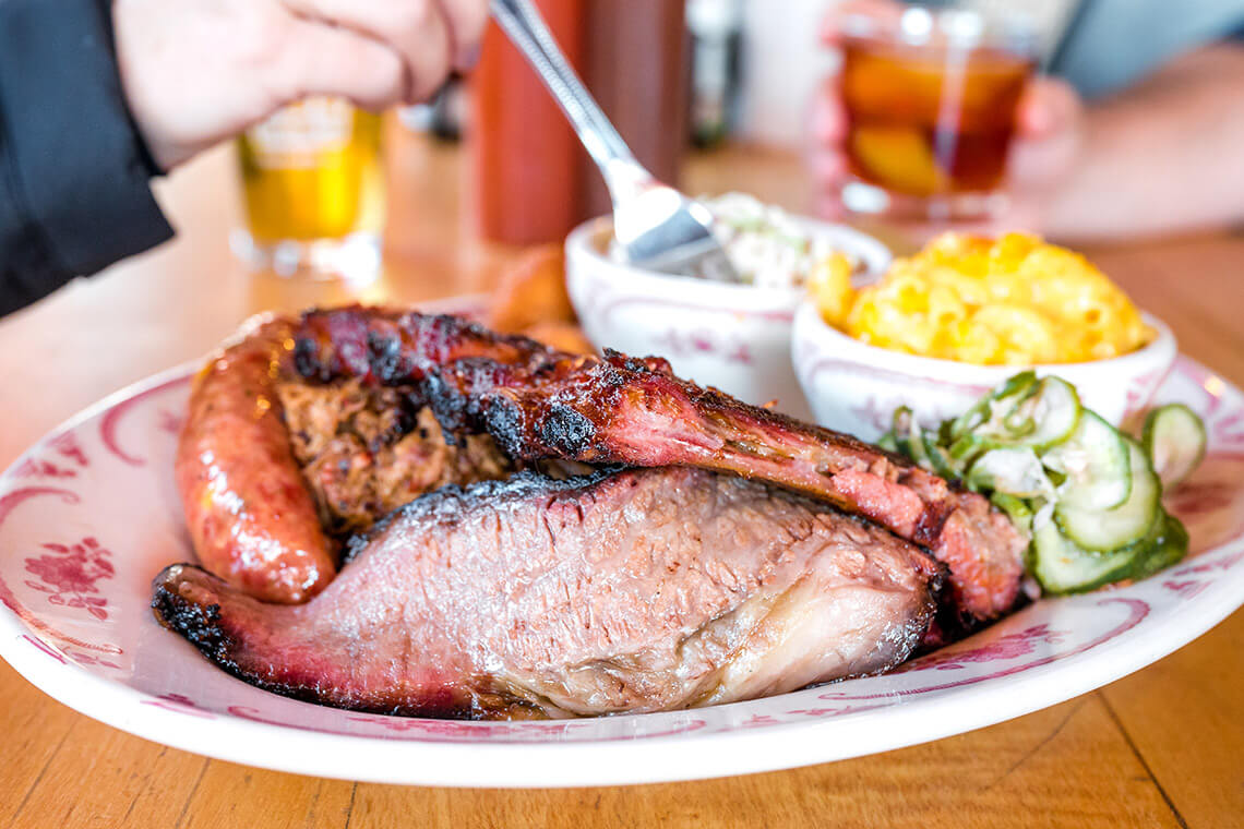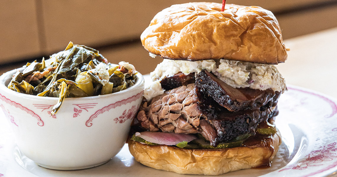 Signature flavors shine in fixin’s like porky pinto bean and potato salad all the way through dessert (the coconut pie recipe remains a family secret). But as the “Smokehouse” in the name implies, house- smoked meat stars on the menu. Start with a round of wings for the table — they’re smoked over pecan wood until crispy and juicy, and then tossed in your choice of sauce. Next, take your pick between barbecue classics, like pulled pork or pulled chicken, saucy St. Louis-style ribs, spicy sausage links, and barbecue chicken. There are also smokehouse spins on classic comfort foods, including pot roast (made using tender, pit-smoked beef) and tenderloin tips. Can’t pick just one? Go for the LTD (Living the Dream) plate, loaded with ribs, barbecue pork, pot roast, and barbecue chicken.