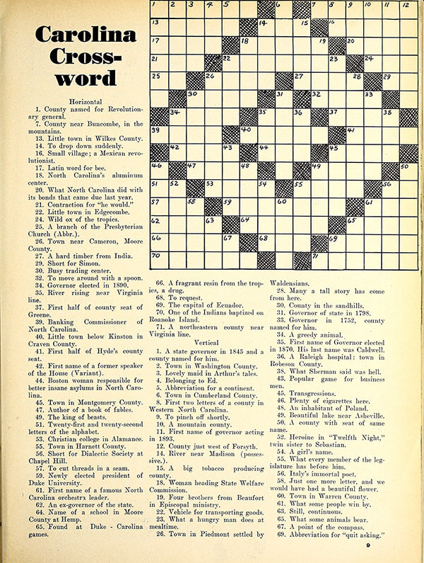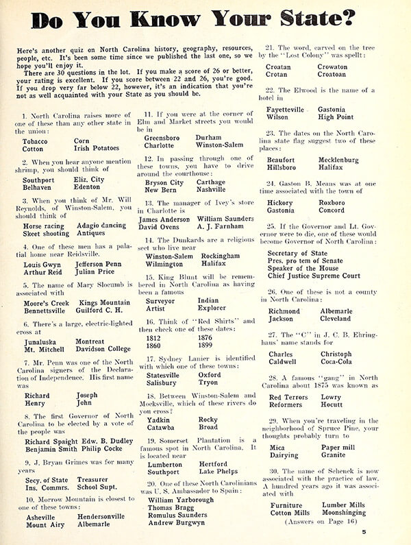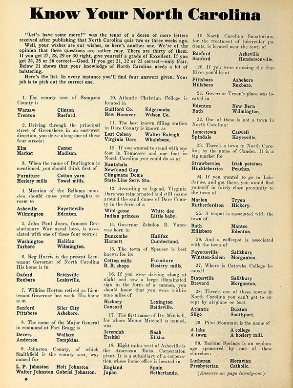 Quizzes were a popular addition to the magazine in the ’30s and ’40s, and our editors at the time encouraged readers to grade themselves — and they weren’t pulling punches when they created their rubric: “We’re of the opinion that these questions are rather easy. There are thirty of them. If you get 27, 28, 29, or 30 right, give yourself a grade of Excellent. If you get 24, 25, or 26 correct — Good. If you get 21, 22, or 23 correct — only Fair. Below 21 shows that your knowledge of North Carolina needs a lot of bolstering.”