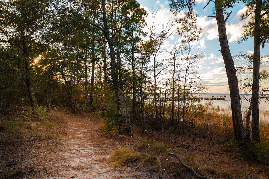 On the five-mile out-and-back Lakeshore Trail, trek through pine and hickory forests and alongside cypress stands and sandy beaches. For a shorter route, try the .65-mile Loblolly Trail or the 1.8-mile Pine Woods Trail. On both, you can look for rare Venus flytraps. On the 0.75-mile Sand Ridge Nature Trail, see Spanish moss and reindeer lichen. For those short on time, swing by the pedestrian or the 375-foot pier to take in the views.