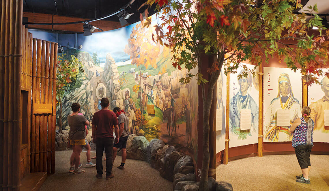 After being greeted by a 20-foottall wooden sculpture of Sequoyah, the creator of the Cherokee syllabary, visitors at the Museum of the Cherokee People embark on a journey through the history of a proud nation. “There are many of us that may have gone to natural history museums and seen dioramas of Native people along with dinosaurs and rocks,” says Executive Director Shana Bushyhead Condill. “When our permanent exhibit was created, it was definitely innovative in that it was a story that wasn’t just stuck in time.” The main exhibit details 13,000 years of Cherokee history in the southern Appalachian Mountains, beginning with a creation story — how the Water Spider brought fire to earth — and carrying through the early 20th century. The museum uses holograms, life-size figures, archaeological artifacts, self-guided audio tours, and live artisans to demonstrate Cherokee traditions, arts, and storytelling. Condill wants visitors to walk away knowing that Native people are more than just the past: “We are still here, still thriving, still creating, and innovating.”