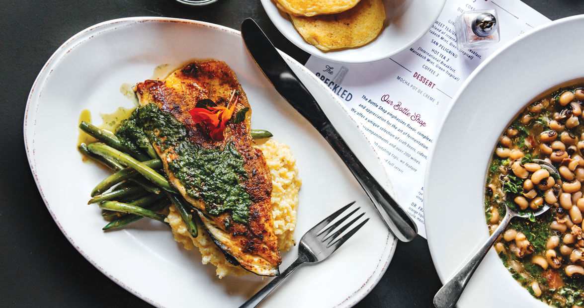 Above: At The Speckled Trout, a combination restaurant/bottle shop, beers and wines are carefully selected to pair with Appalachian-inspired dishes like blackened mountain trout and Gouda grits and soup beans — black-eyed peas and kale in ham hock stock, served with hoecakes and molasses butter.