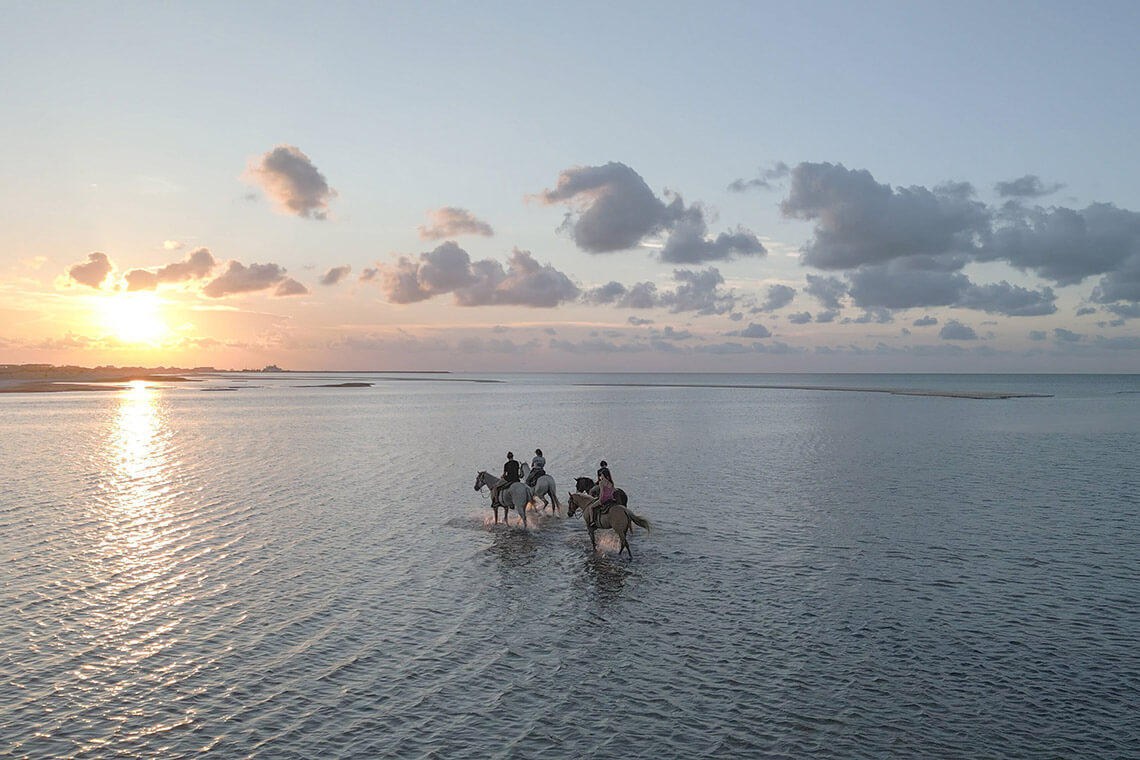 For a sunset-viewing experience that feels like being perched on the edge of the world, venture out to Ship Shoal Island on horseback. photograph by Austin Rooper from Rooper’s Stories