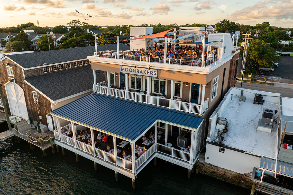Overlooking Taylor’s Creek, Moonrakers’ rooftop draws waterfront onlookers. Photography courtesy of Moonrakers