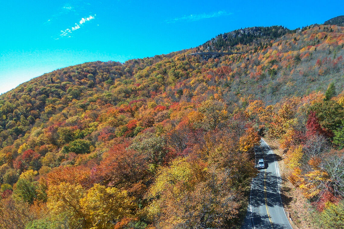 You might spot Linn Cove Viaduct curving around Grandfather Mountain from Little Parkway — once the primary road connecting Linville and Blowing Rock before the Blue Ridge Parkway was built. Photography courtesy of NC Scenic Byways