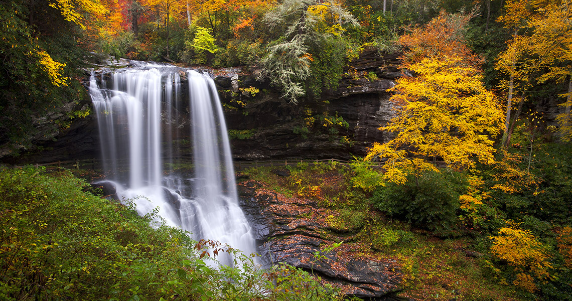 A long drive calls for a hearty meal. Start the trip off with the Hungry Man’s breakfast — pancakes, eggs, and bacon or sausage — at the Country Skillet in Rosman before hopping on the byway. Or have a cappuccino and a bagel at Buck’s Coffee Café in Cashiers. Outside of Cashiers, it’s a short hike to the 411-foot Whitewater Falls.