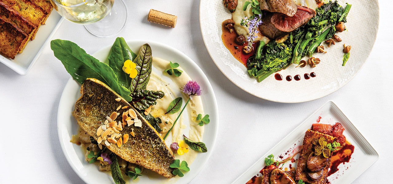 Seasonal entrées at Library Kitchen + Bar include (clockwise from left) coriander sautéed trout, Burgundy-braised Black Angus short ribs, and sautéed foie gras. photograph by Tim Robison