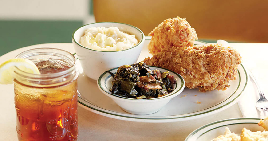 Pair The Bluffs’ famous fried chicken with sides like collard greens, cathead biscuits, mashed potatoes, and something sweet, like blackberry peach cobbler. photograph by Stacey Van Berkel