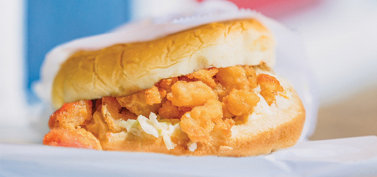 The shrimpburger at Big Oak Drive-In & BBQ in Salter Path is legendary: fried shrimp, tartar sauce, slaw, and ketchup on a steamed bun. photograph by Baxter Miller