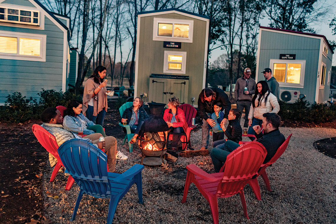 At the River and Twine tiny-house hotel, just a short walk from Rocky Mount Mills — a former cotton mill on the Tar River that is now filled with restaurants and breweries — 21 tiny homes are arranged in pods, each with a gas firepit, a gas grill, and a clay standalone firepit called a chiminea. “You have your separate tiny homes for individual families,” says Julie Baggett, assistant property manager of Rocky Mount Mills and River and Twine, “but together with other relatives — grandparents, cousins, aunts, uncles — you’re able to sit around the campfire and enjoy each other.” Guests can play outdoor games like cornhole, team up at a wiffle ball field, play disc golf on the nearby Tar River Greenway, or simply relax in hammocks, appreciating each other’s company.
