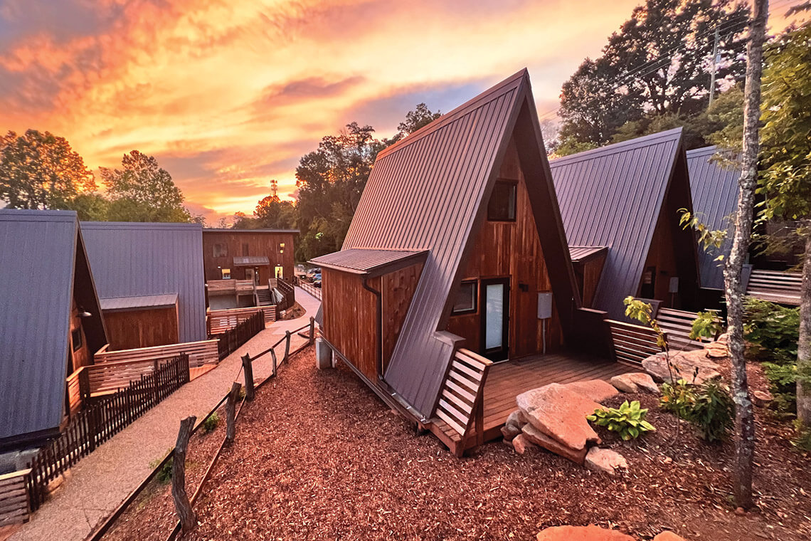 Together, Wrong Way’s A-frame cabins resemble a mountain range or waves.<br><span class="photographer">photograph by JOE BALCKEN AND STEVEN FREEDMAN, COURTESY OF WRONG WAY ASHEVILLE</span>