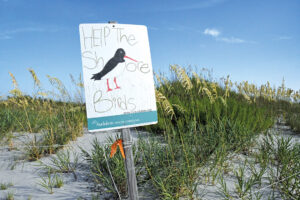 “Bird stewards” organized by Audubon NC post signs — adorned with art by local fifth graders — to help protect black skimmers and other shorebirds nesting on busy Wrightsville Beach. photograph by Tom Earnhardt