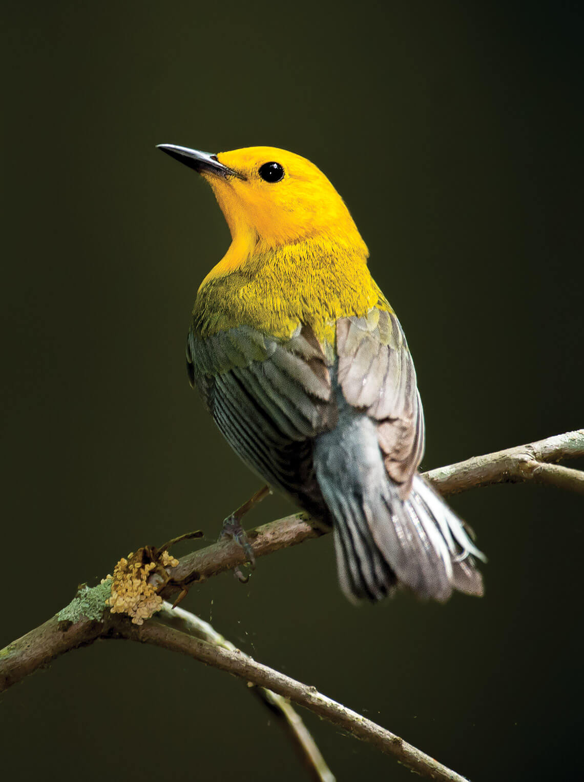 Prothonotary warblers are unmistakable with their yellow bodies and blue-gray wings. photograph by Jared Lloyd