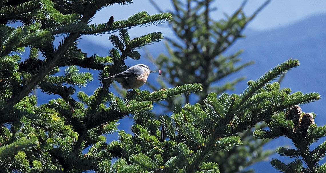 North Carolina’s boreal forests (higher than 5,000 feet) of spruce and fir hold a number of species not usually found at lower elevations — including the red-breasted nuthatch. These acrobats in the treetops are incredible climbers, able to clamber straight up tree trunks, or straight down. Unlike other nuthatches, “red-breasteds” migrate from their nesting areas during some autumns and winters, perhaps in search of better food supplies at lower elevations.