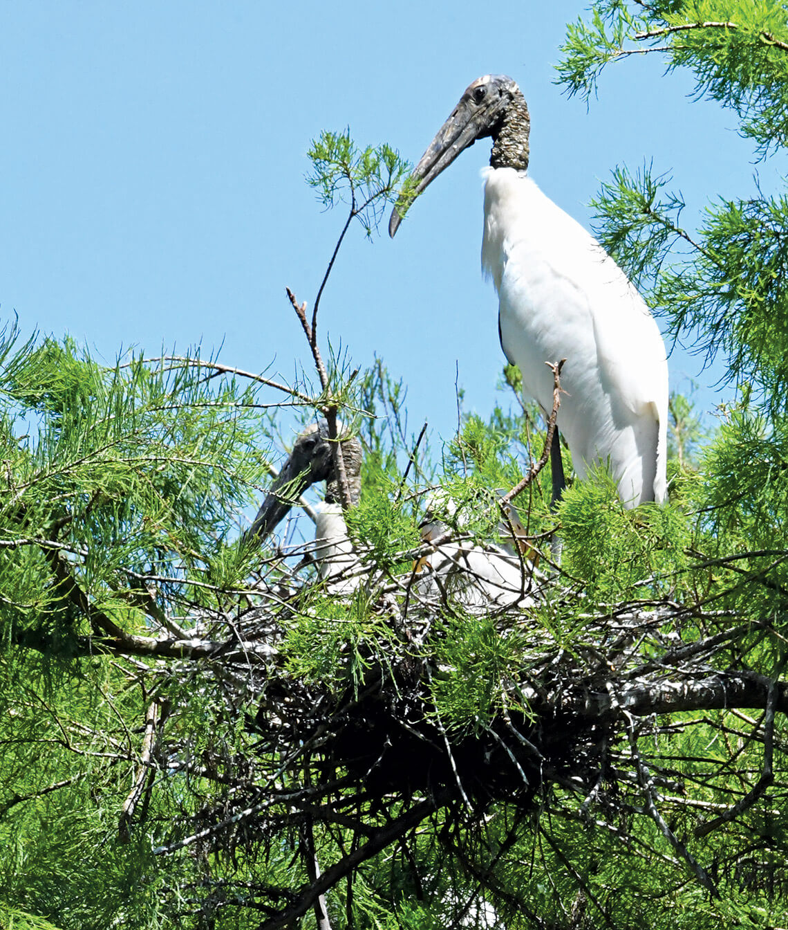 With a featherless head, elegant black and white feathers, and a five-foot wingspan, the wood stork is a grand addition to this state’s roster of nesting birds. photograph by Tom Earnhardt