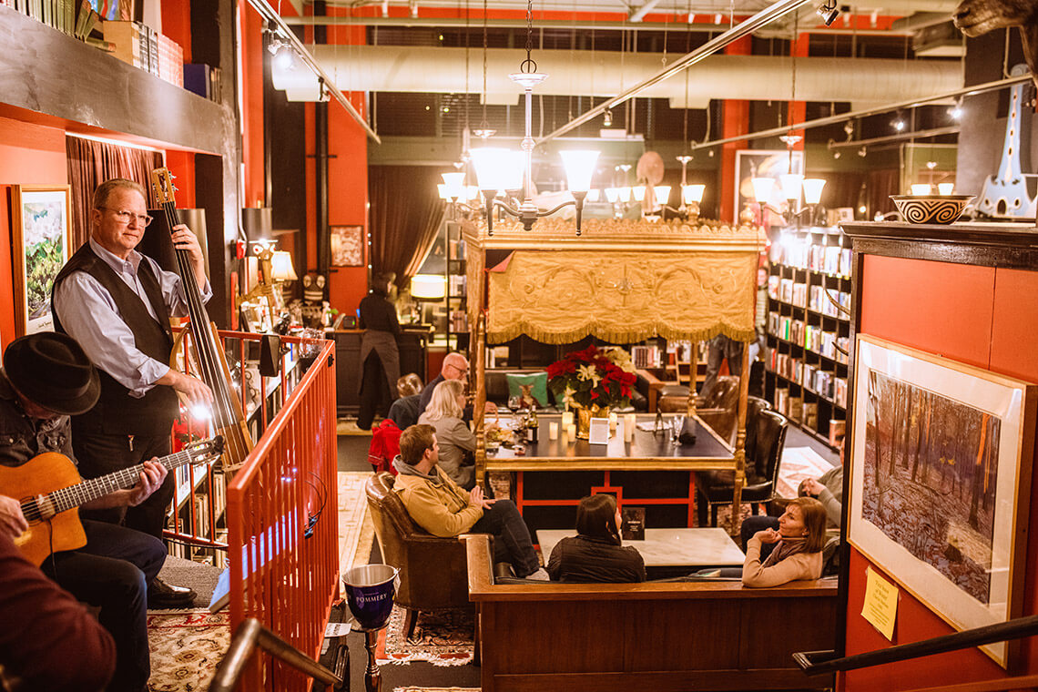 The idea came to Thomas Wright, co-owner of Battery Park Book Exchange & Champagne Bar, after a career in industrial chemical manufacturing and restaurant management: “He wanted to do something different,” says his wife and co-owner, Donna. After purchasing a small bookstore in Little Switzerland, the Wrights opened a bookstore in Asheville’s historic Battery Park Hotel, later moving to the Grove Arcade in 2010 Today, the establishment is home to around 20,000 gently used books, stacked on shelves that span three levels.