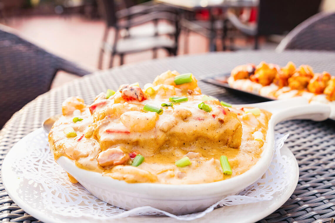Different preparations of local shrimp shine at restaurants throughout Morehead City, like the shrimp napoleon at Floyd’s 1921. photograph by Bluefin Artistry, Courtesy of Downtown Morehead City, Inc.
