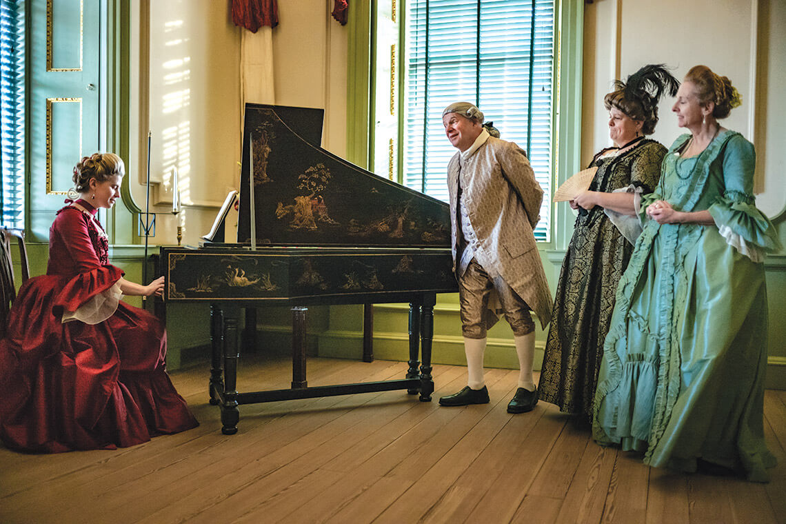 During Candlelight, colonial characters wearing period dress perform short vignettes around the palace. Last year, Allyson Eubanks, as the real-life figure Ann Cogdell, played the harpsichord for party guests portrayed by Ed Jekel, Chris Rivera, and Noreen Jekel. photograph by Charles Harris