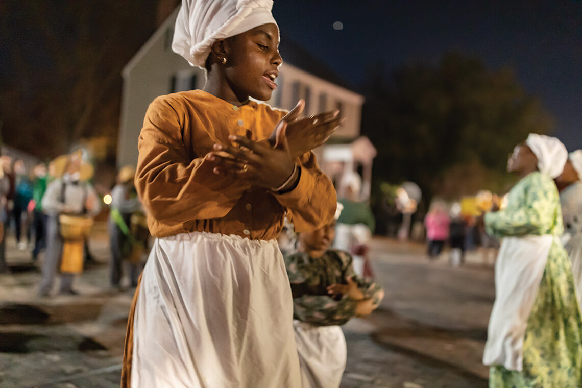 As part of the tradition of Jonkonnu, drummers and dancers like Camille Staten perform in the public square to show how some enslaved people might have celebrated Christmas. photograph by Charles Harris