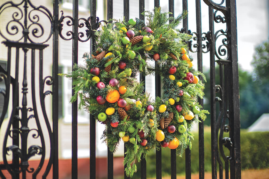 Candlelight strikes a balance between the simplicity of the 18th century and the finery that visitors may expect to see, like the wreath, laden with fruit in the Della Robbia style of the Italian Renaissance, adorning the palace’s front gate. photograph by Charles Harris