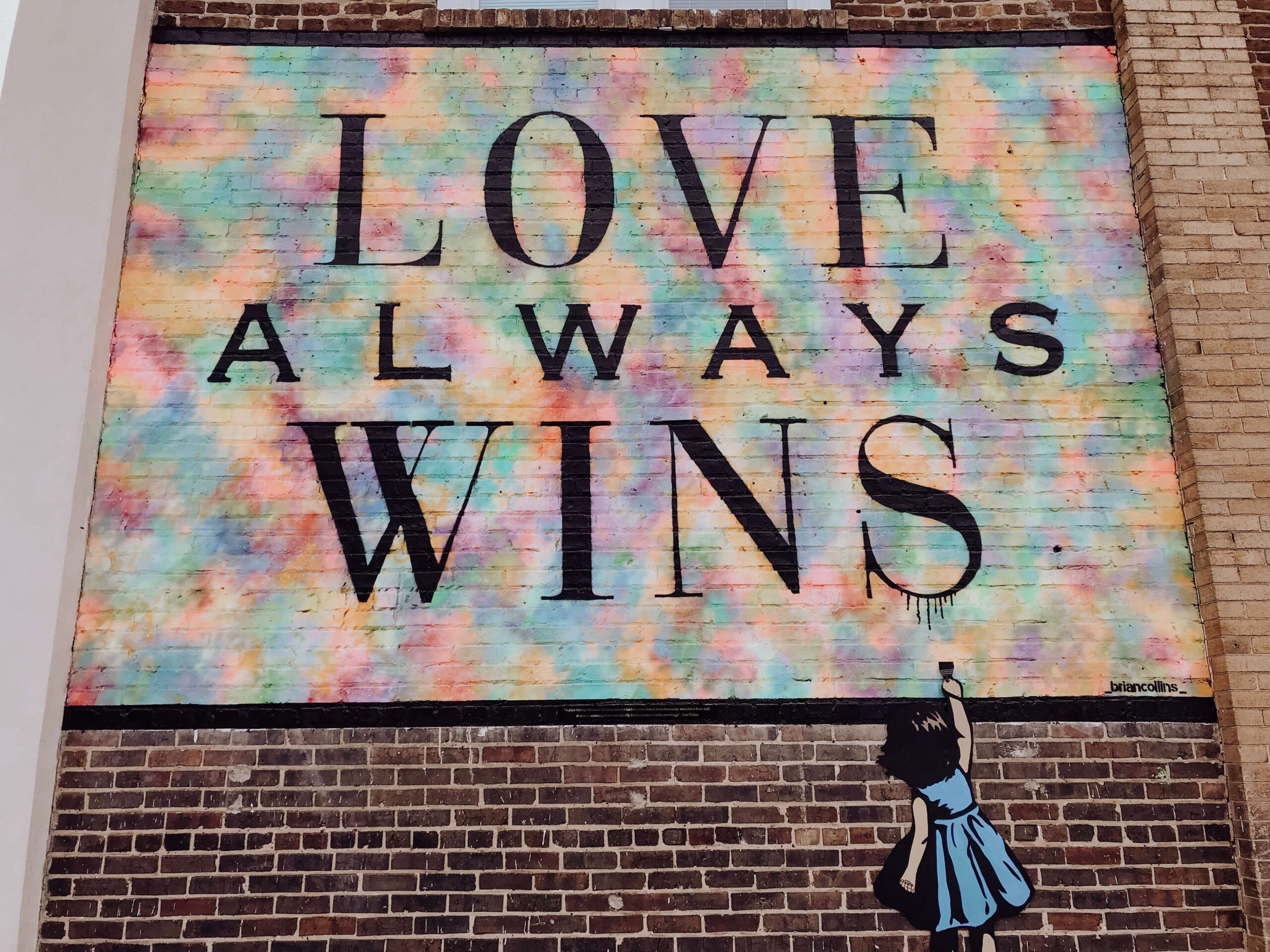 On the side of a brick building in downtown Graham’s Court Square, black block letters spell out “Love Always Wins” against a blue, pink, and yellow background. At the bottom, a painted little girl stands on a stack of books and reaches up, touching the message.