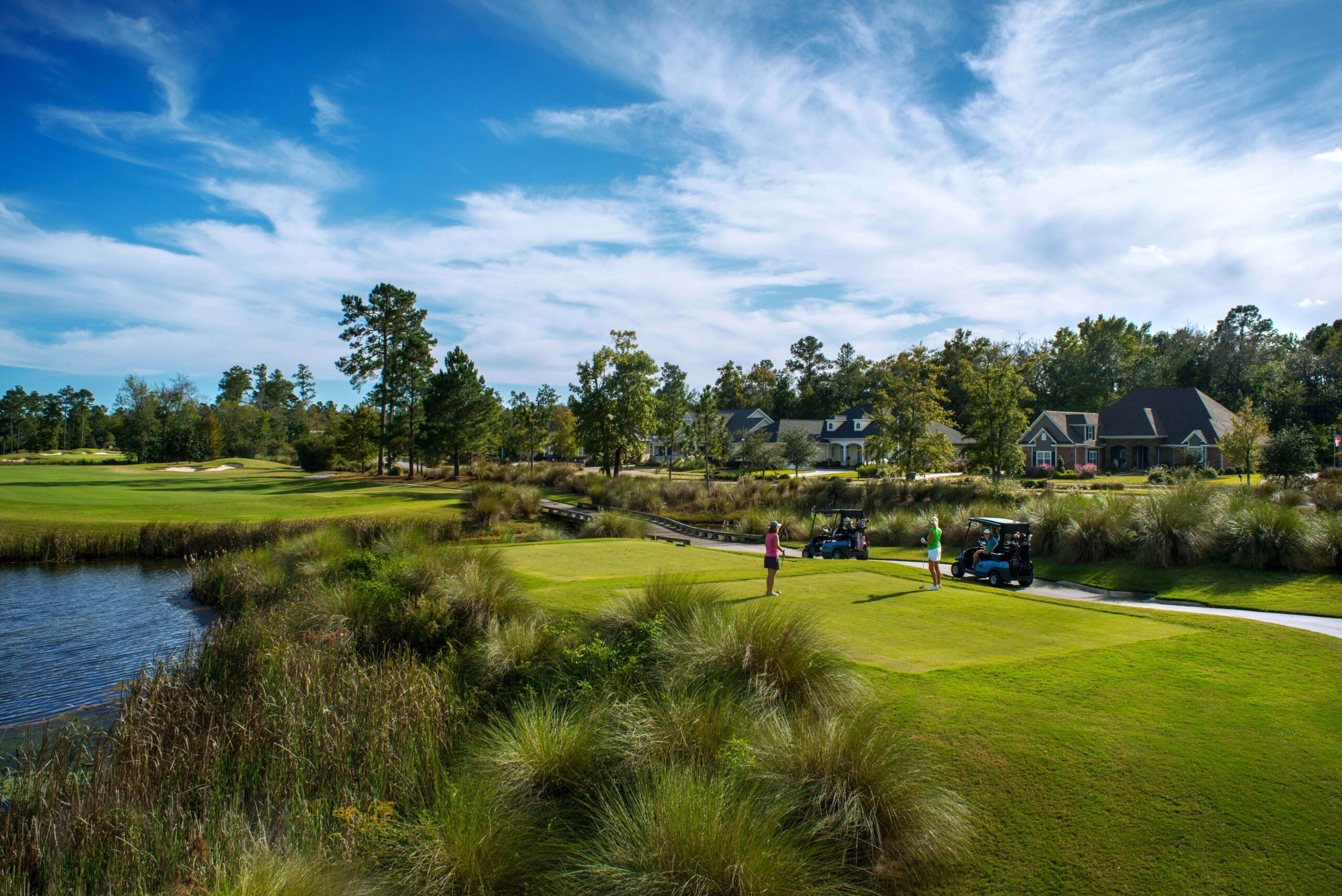 Public tee times are available at the award-winning Cape Fear National Golf Course at Brunswick Forest, where you can enjoy a scenic backdrop that includes three waterfalls, wetlands, beach bunkers, and native wildflowers. photograph by Leland Tourism Development Authority