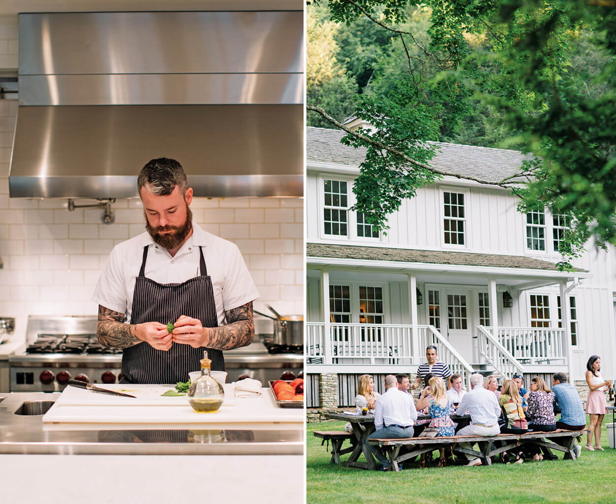 The inn’s former chef, Sean McMullen (left), fields questions from guests while preparing seasonal suppers. At special outdoor dinners, guests gather around tables built by Frank. photograph by Revival Creatives