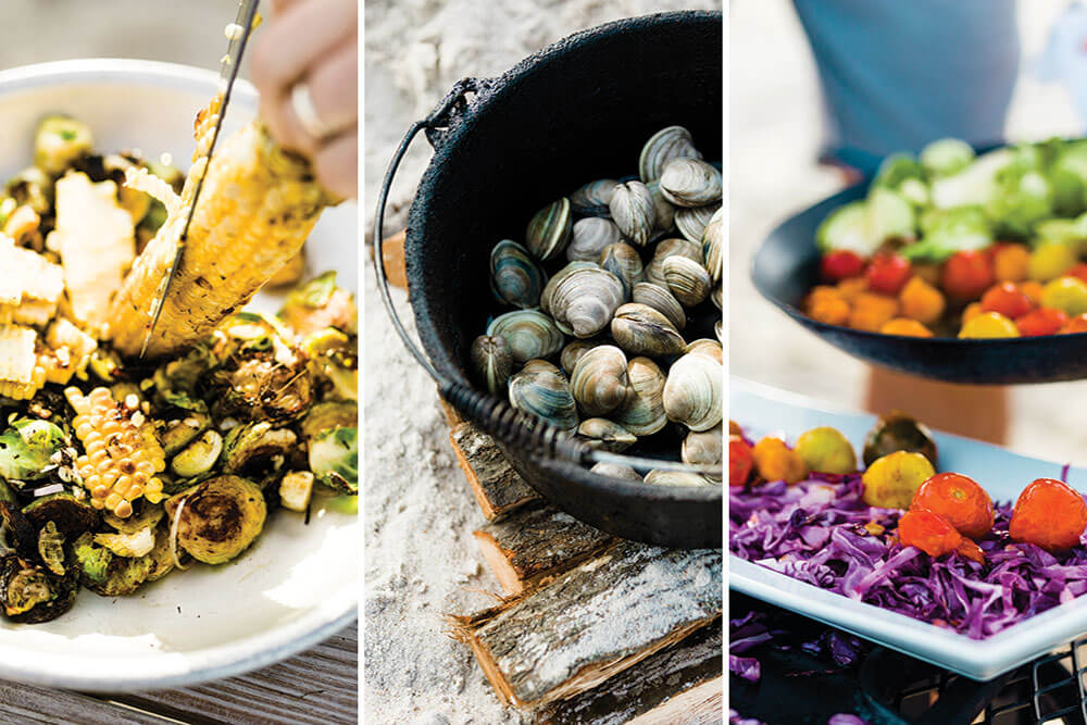 The gang’s all here: Roasted Brussels sprouts, red cabbage, and sweet corn accompany the fruits of the sea. photograph by Baxter Miller & Ryan Stancil