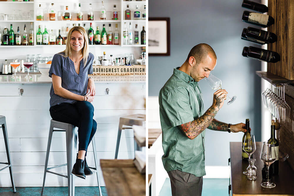 General Manager Annalee Berry and Wine Director Phil Castelluzzo focus on pre-dinner details. The digits on the wall and elsewhere are a nod to the jersey numbers that surfers wore in competitions in the ’60s. photograph by Baxter Miller & Ryan Stancil
