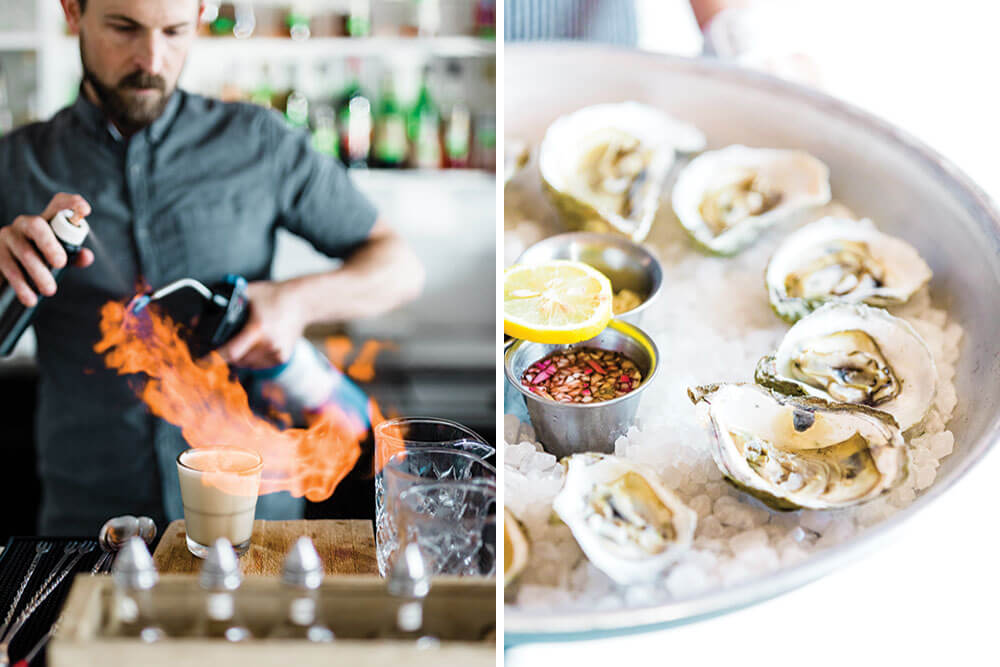Signature cocktails like Greg Ewan’s “How to Make a Fire” and oysters on the half shell fuel a lively bar scene at the Surf House. photograph by Baxter Miller & Ryan Stancil