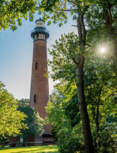 Since 1875, this 162-foot, unpainted red-brick lighthouse has guided mariners away from danger. The northernmost lighthouse in North Carolina, it has 220 steps that lead to spectacular views of the Currituck Sound, Atlantic Ocean, and The Northern Outer Banks.
