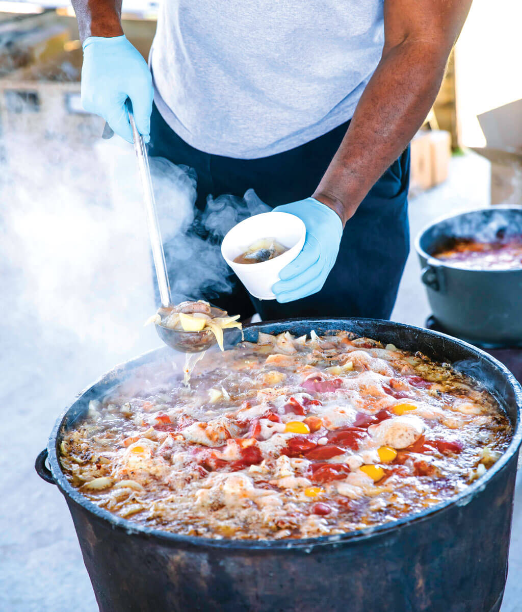Tomha McMillan carefully dishes up a bowl of fish stew at the festival. It sells well, and raises money for the Ayden-Grifton football team, but, in his words, “it’s super hot.” photograph by Geoff Wood