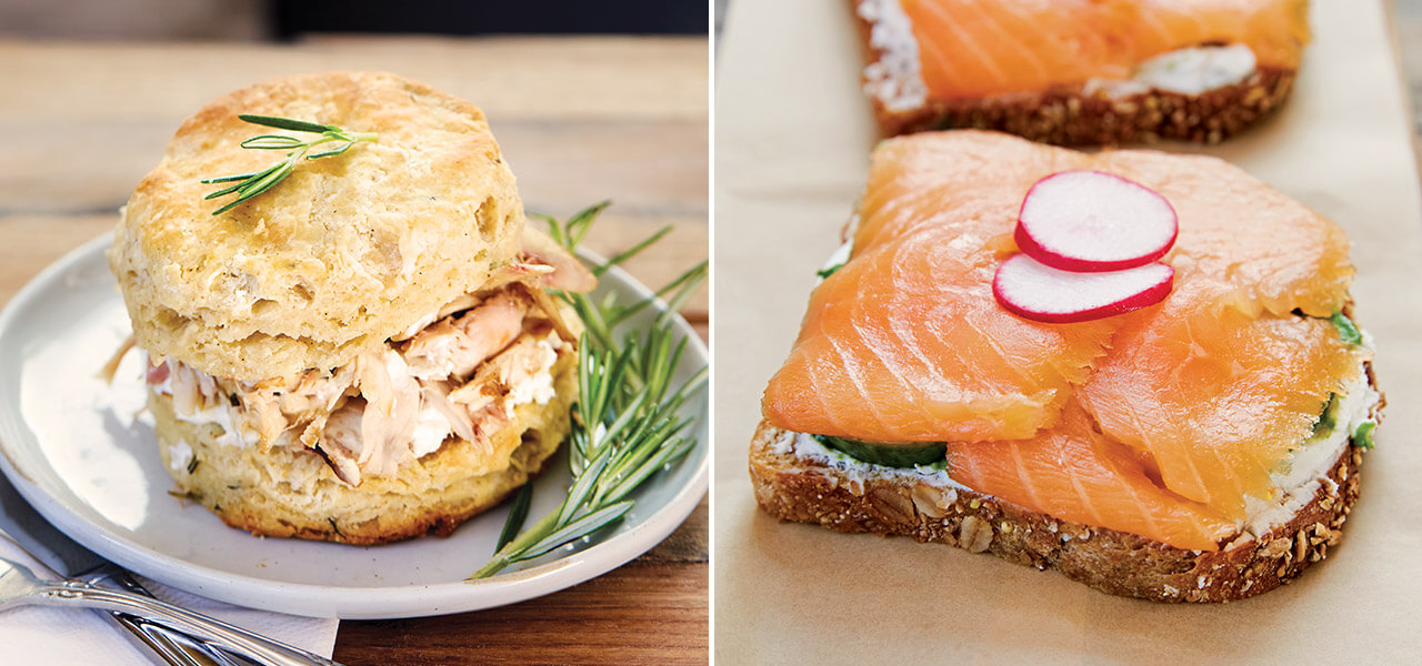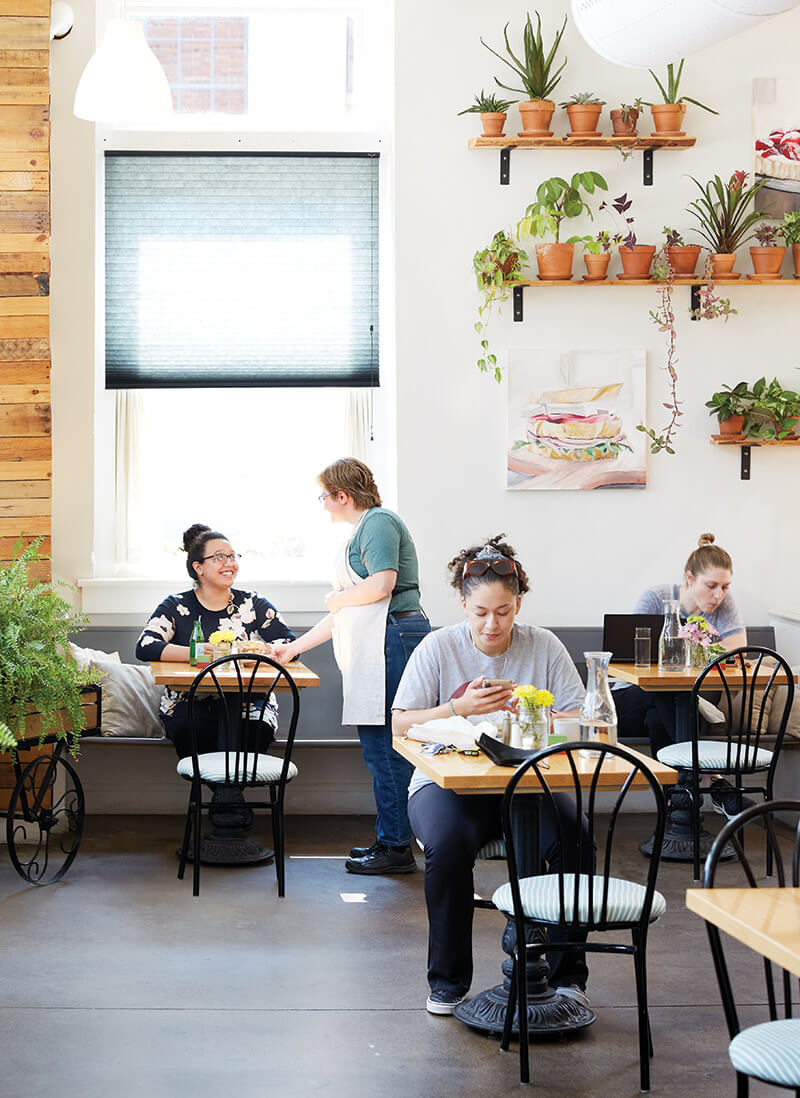 Angelina Burbey’s hands are full. As she crosses from Chez Genèse’s kitchen into its sunny dining room, she balances a wooden paddle holding an open-faced smoked salmon sandwich and a toasted rosemary biscuit spread with herbed goat cheese and piled with roasted chicken. She places the entrées at a table of four and heads back for the lemon-ricotta pancakes and the heirloom tomato tart. In the office, an oversize poster spells out 10 “Steps of Service.” No. 3: “Don’t be a hero!”