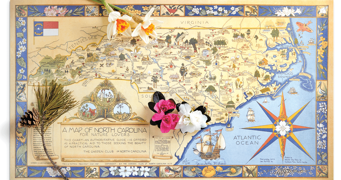 Although mine is not the original version of the NLMNC — the first was commissioned by the Garden Club of North Carolina in 1937 and designed by Miss Mabel Pugh, head of the art department at Peace College — I think of it as rare. My map was designed (or updated) in 1966, and the woman who sold it to me claimed that there were few to be found, so it certainly feels more authentic than the latest version, printed in 2014.