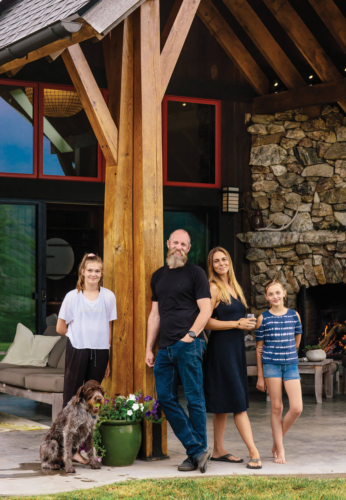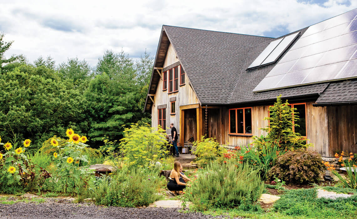The Doellgasts — Sierra, Hans, Tina, Oriah Sparrow, and Wyatt, their wirehaired pointing Griffon — pose on their porch around a column made from white oak. In the front yard (below), Tina and Oriah Sparrow do a little gardening as Hans fires up the grill. The solar panels on the roof provide 6.5 kilowatts of power to the home. photograph by Tim Robison