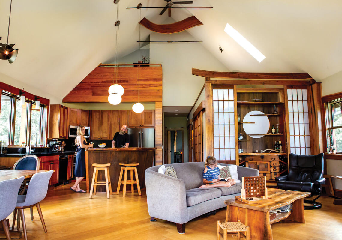 Oriah Sparrow reads in the stillness of the living room as Tina and Hans relax in the kitchen. At right is a whiskey and sake bar with shelves meant to resemble clouds drifting across the moon. photograph by Tim Robison
