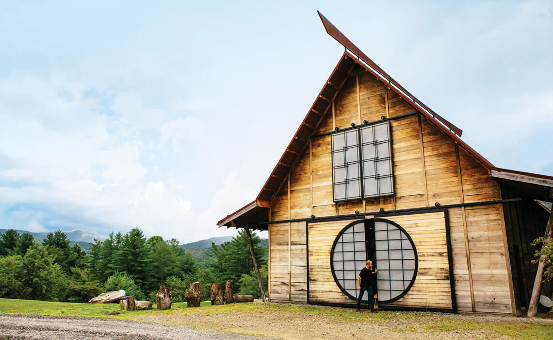 Hans isn’t the only one in the Asheville area who’s found peace in the convergence of Japanese and Appalachian architectural styles. About half an hour northeast of Fairview, Jim and Susan Jones’s home sits at the bottom of a holler in Black Mountain, with a sweeping roof, angled to offset the mountains beyond, that has a similar Japanese feel.