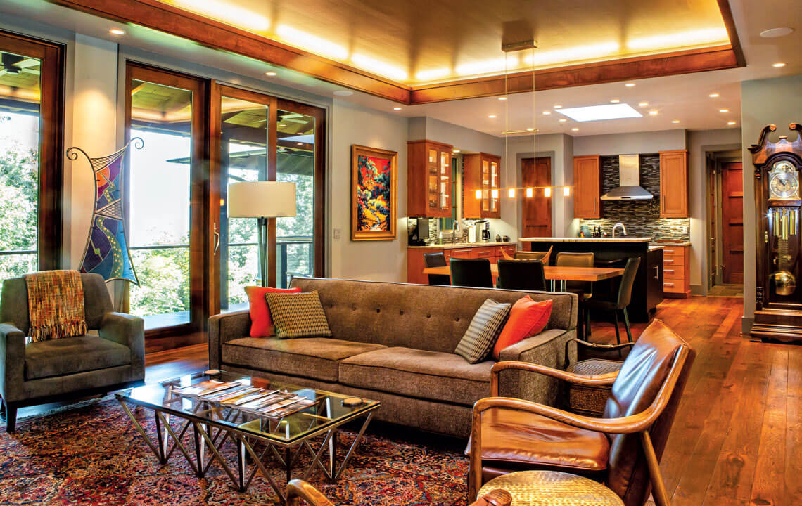 Susan and Jim Jones entertain guests in their 1,100-square-foot great room with sliding glass doors overlooking the Swannanoa Valley and contemporary furniture that’s paired with a traditional Karastan rug. photograph by Tim Robison
